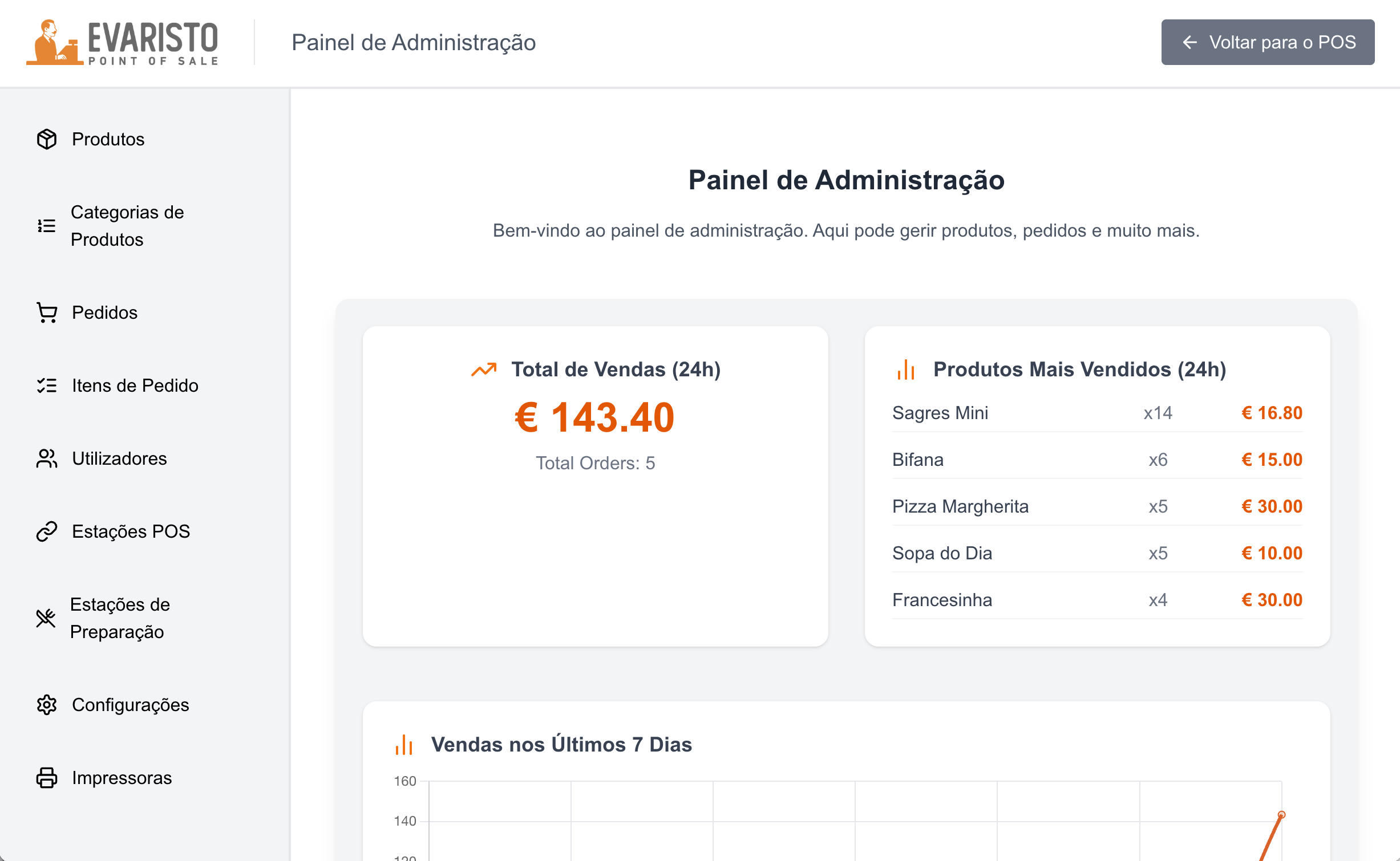 O Evaristo é um sistema de ponto de venda (POS) focado em operações internas, gestão de pedidos e impressão de cupões. Não está certificado pela Autoridade Tributária (AT) para emissão de faturas ou documentos fiscalmente relevantes. Se pretender utilizar o sistema para efeitos fiscais, confirme previamente as suas obrigações legais. A responsabilidade pela conformidade fiscal cabe inteiramente ao utilizador.